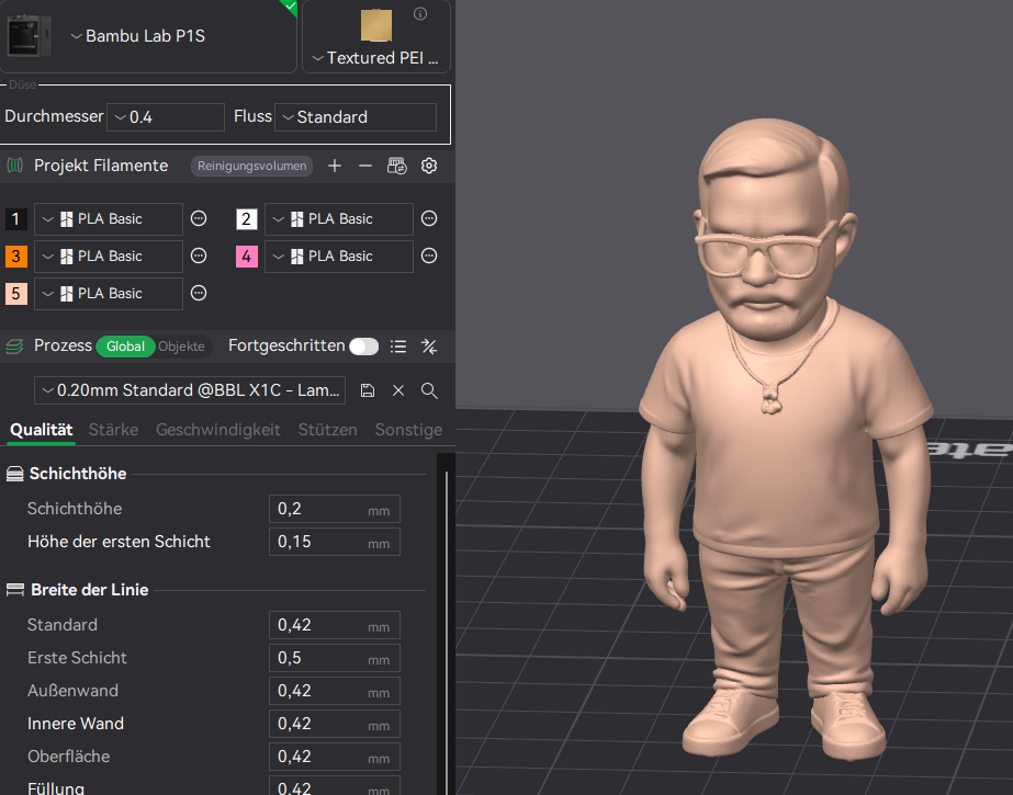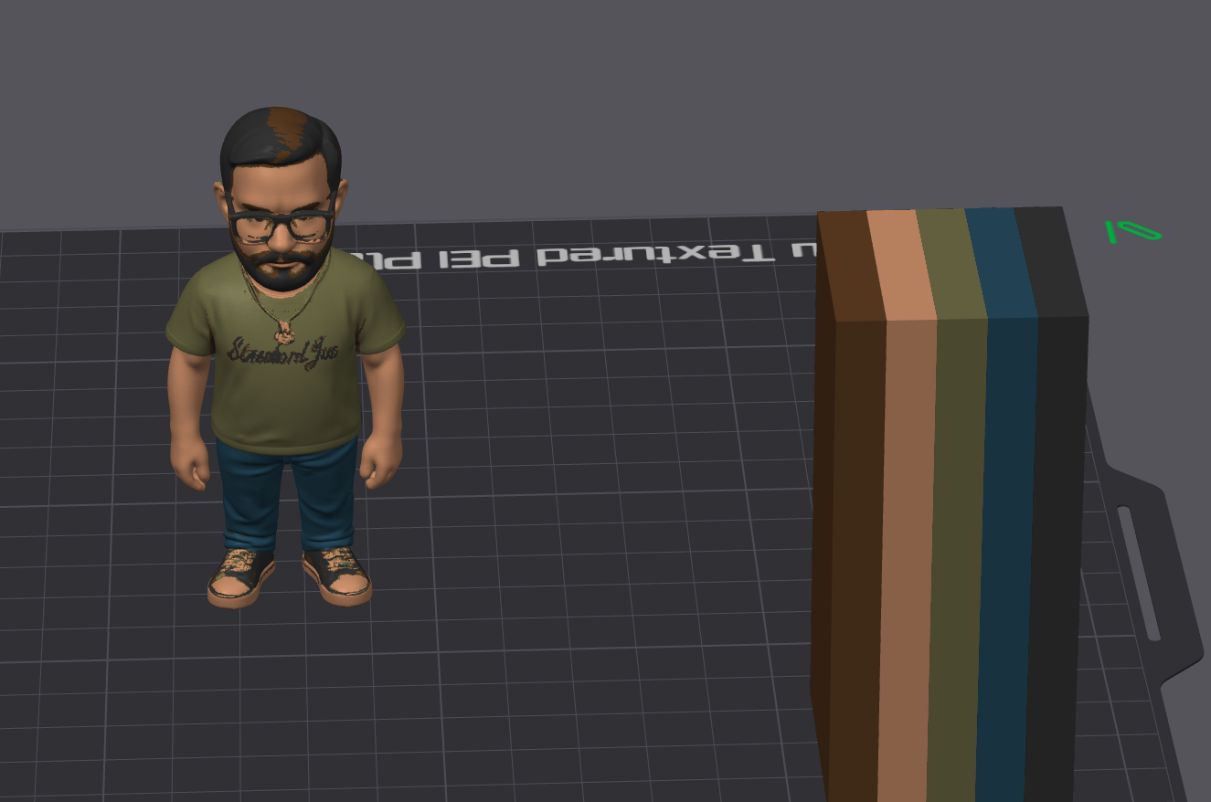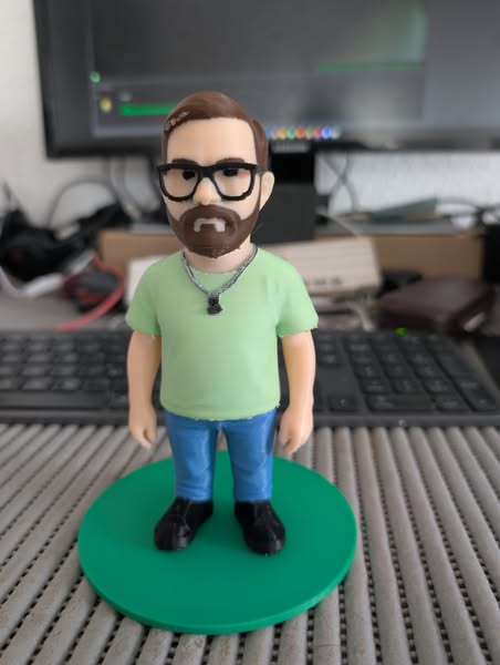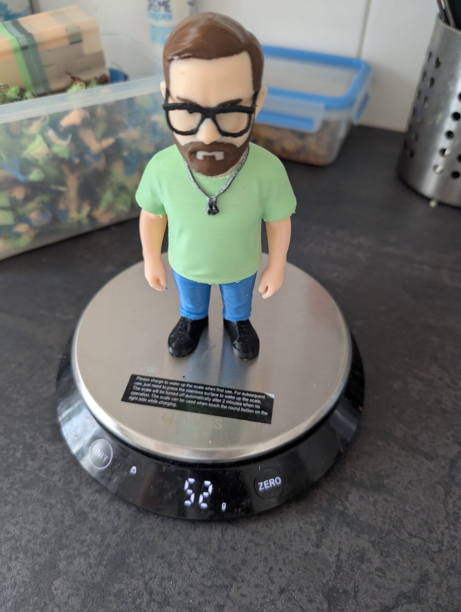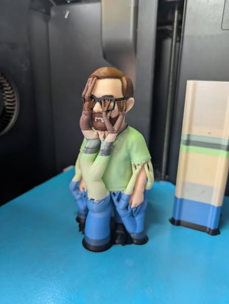 Aus einem Foto (was ich Euch erspare) die Vorlage einer "Comic Figur" und ChatGTP erstellen lassen, das ganze dann in der Makerworld umwandeln lassen in eine OBJ Datei und dann im Bambu Studio Farben zugeordnet und nachgemalt was nicht gepasst hat.
