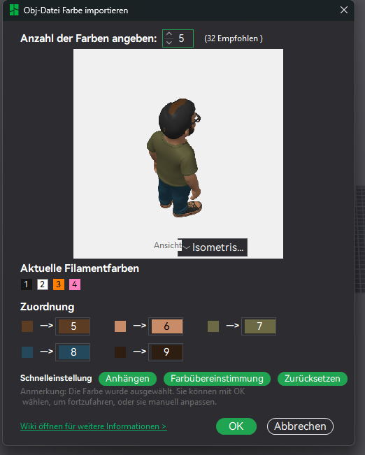 Dort ist die Empfehlung bei "Anzahl der Farben angeben" gleich die Anzahl an Farben anzugeben die Ihr dann Verwenden wollt für Euer Modell. Das ganze dann mit OK Bestätigen, dann erhaltet Ihr Euer Modell in der Vorschau so :