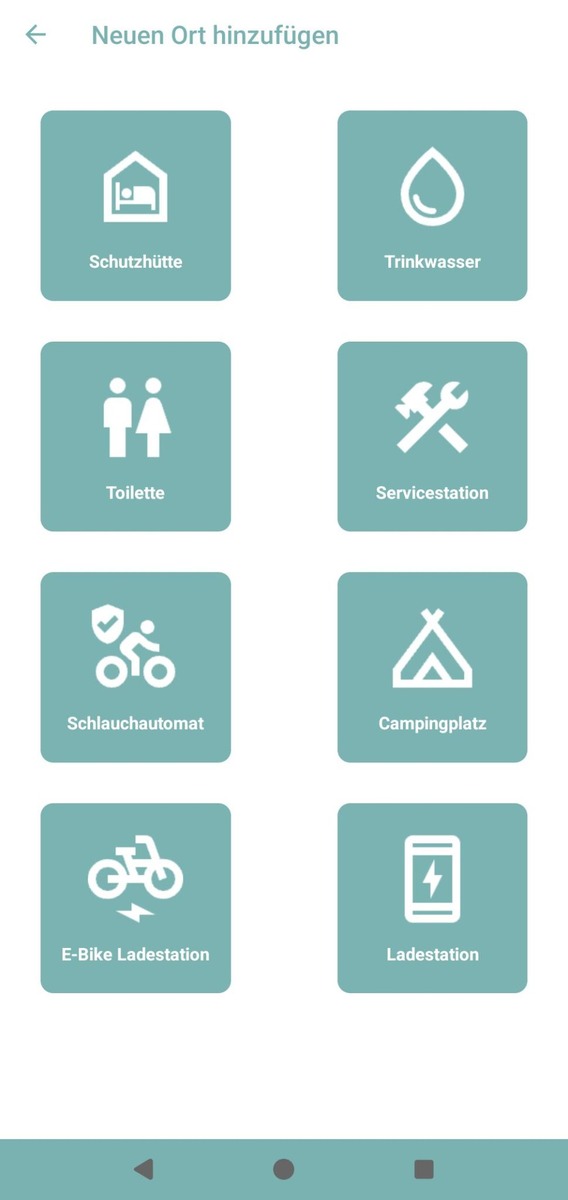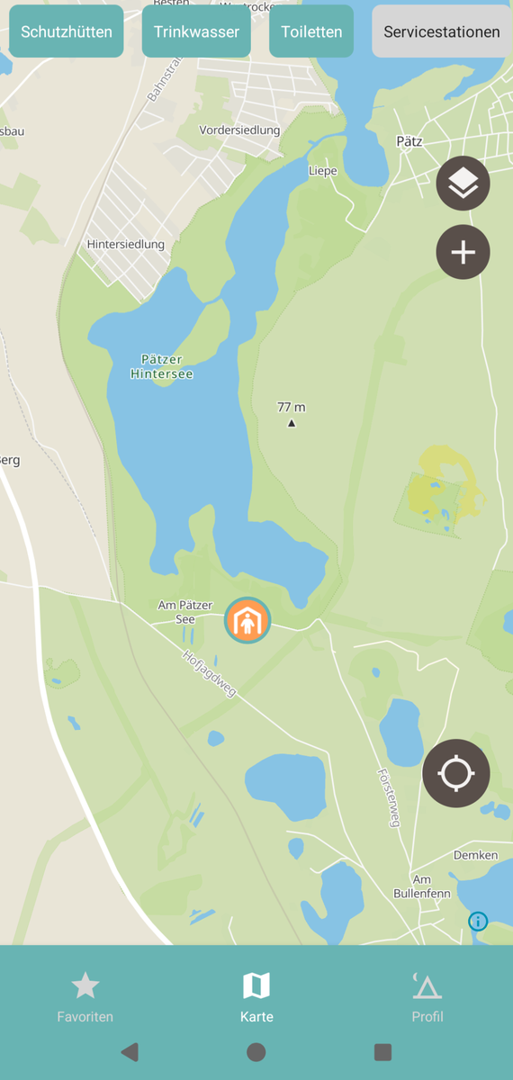 Nach dem öffnem der App kommt man zur Karte und kann am Oberen Rand Filter einstellen was man alles angezeigt bekommen möchte. In diesem fall habe ich für mich persönlich, Schutzhütten, Trinkwasser & Toiletten eingestellt. Es gibt noch Servicestationen & Schlauchautomaten, falls man auch mal ein Problem mit dem Rad hat.